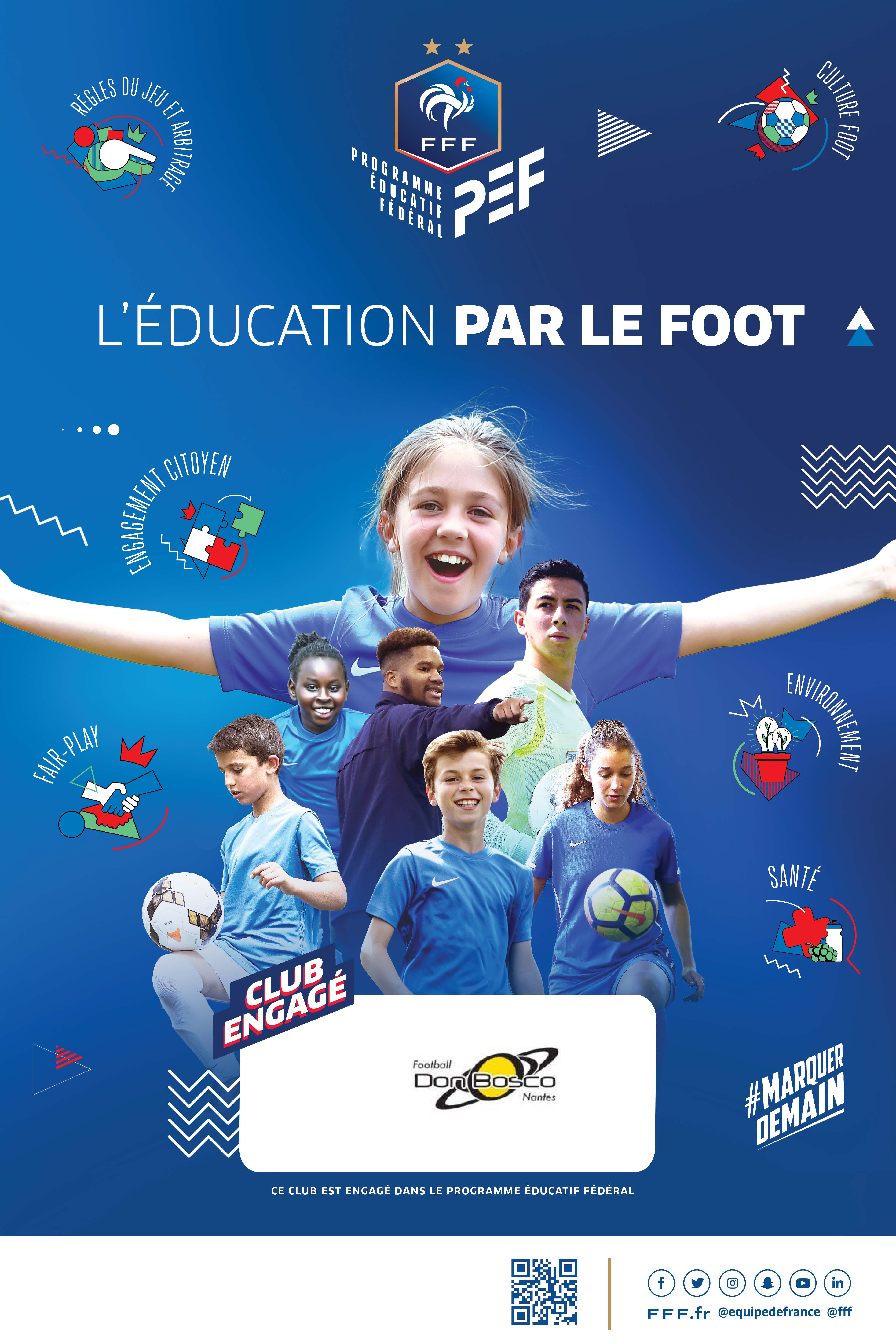 Lancé en 2014 par la FFF, le Programme éducatif fédéral (PEF) est un outil pédagogique complet , mis à la disposition des ligues, districts, clubs amateurs et professionnels, dirigeant(e)s et éducateur(trice)s, pour former les jeunes licencié(e)s U6 à U19 (5 à 18 ans) aux règles du jeu et de vie. Il concerne 800 000 jeunes licencié(e)s et plus de 5 600 clubs l’utilisent déjà. Le PEF se compose de deux parties contenant des Fiches Educatives et des Fiches Actions Terrain relatives aux 6 thèmes abordés.